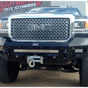 A2 base front bumpers come with a 30″ light bar cutout, cube light brackets that hold two 3″ lights on each side and a winch mount. Bodyguard test fits their bumpers with Rigid LED off-road lights and recommend using a 30″ Rigid E-series light bar, but other brands with the same dimensions will generally fit. You may add both a light bar and winch but if you are planning to install both, you will have to use a smaller frame winch (such as a Warn Zeon 12). If you are planning to add a larger frame winch with a foot forward mount (such as a Warn 16ti, Warn M-Series, or Superwinch Talon Series) you will not have enough room to mount a light bar.