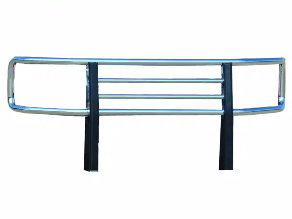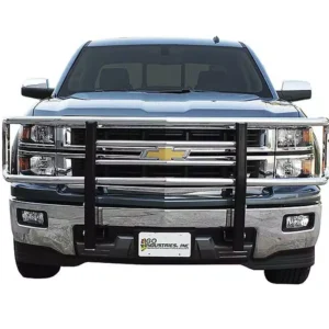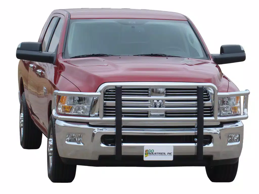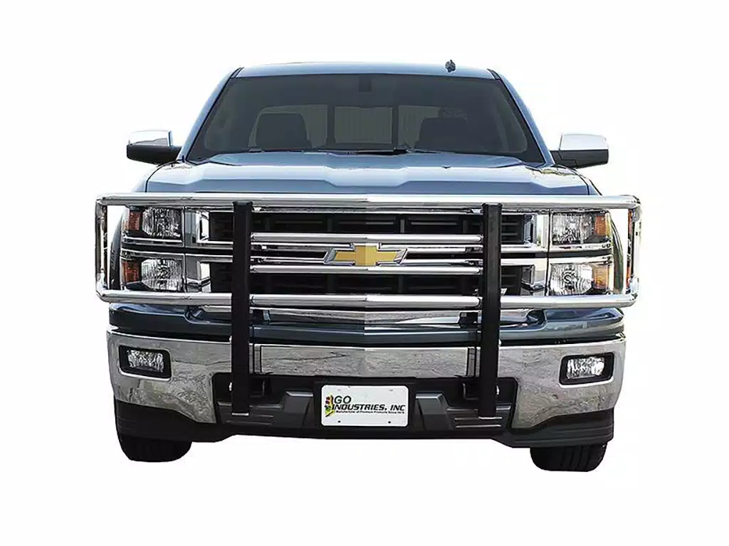 The Go Industries Big Tex Grille Guard is unlike anything else available in the pickup truck aftermarket business. A unique design and giant size tubes result in super stylish looks that won’t bend, flex, or vibrate on the front end of your truck. This grille guard comes in a duplex nickel-chrome plated finish and features heavy-duty rubber push pads. Constructed of one piece tubular framing, using massive 1.9″ 14-gauge steel, and this mega size truck grille guard will withstand the test of time. Heavy duty 11-gauge steel uprights offer maximum strength and a contoured fit as well as use of the factory tow hooks. Most applications for the Go Industries Big Tex Grille Guard feature easy, no-drill, frame mount application. Additionally, this grille guard is covered by the manufacturer for 3-years. If you are looking for that authentic Texas grille guard look, then get yourself a Go Industries Big Tex Grille Guard today!