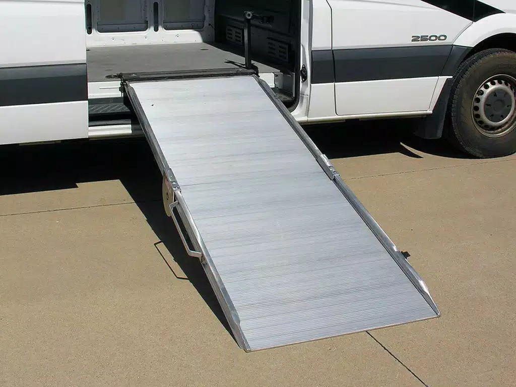 The high-strength Link LB10 side step mount loading ramp is designed for vans with a sidestep and easily stores in the “dead” space above the step. The user-friendly design makes installation a snap, and requires only a few seconds to position for use, making users more efficient. Link LB10 aluminum ramps are available in several lengths & widths to best accommodate your particular needs.