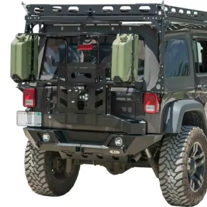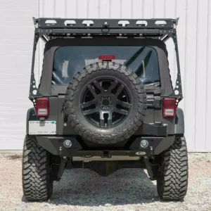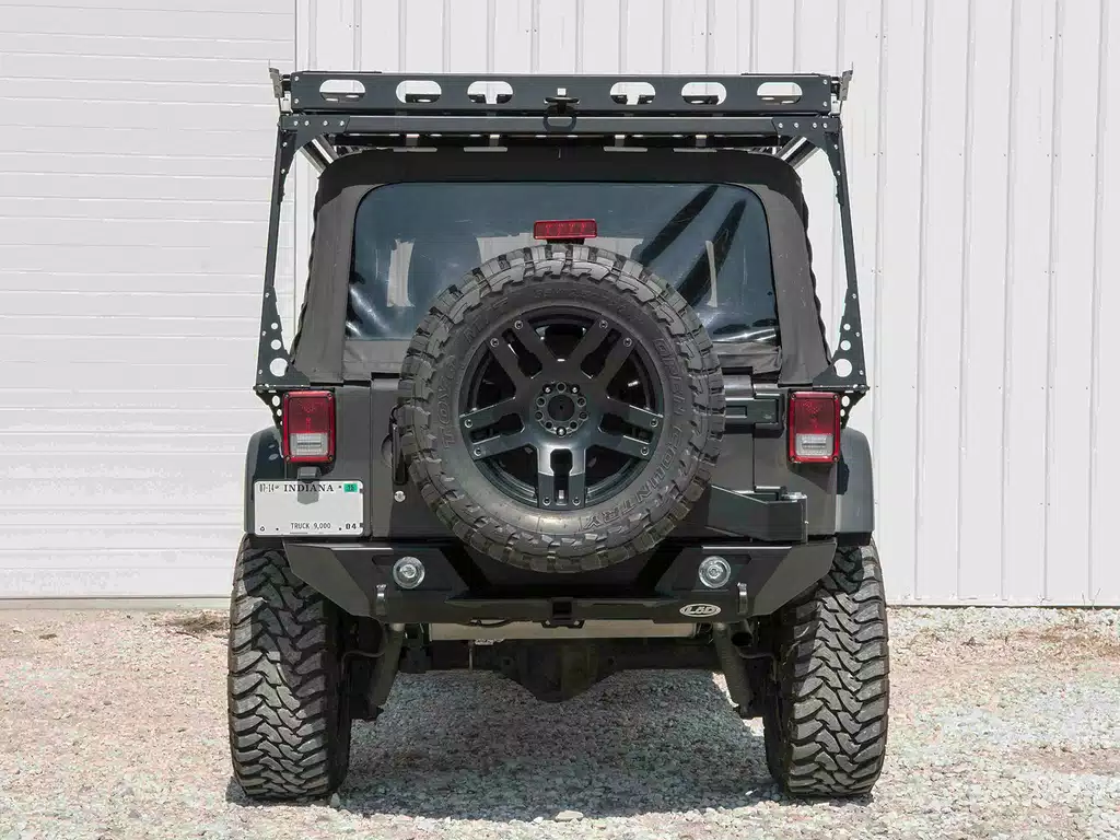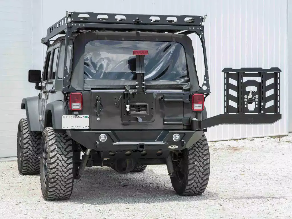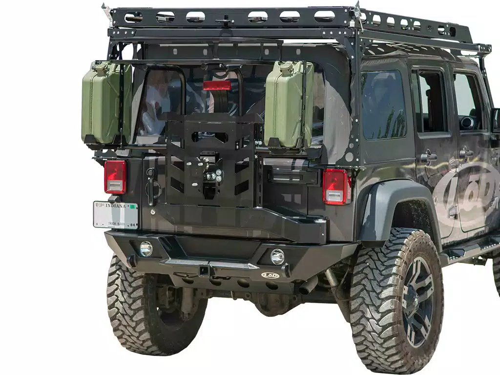 The integrated swing-arm tire carrier is designed to hold oversized wheels securely while reducing stress on your tailgate. With modular accessory mounts, you can customize the system with jerry can holders, RotopaX mounts, trail jacks, and more — making it one of the most versatile Jeep rear bumpers available.