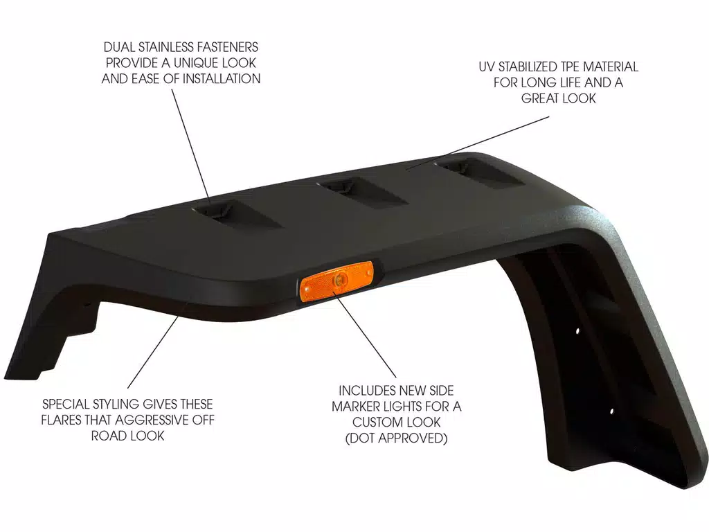 Constructed from impact-resistant thermoplastic, Hurricane Flares are built to take on rocks, mud, and debris without cracking or fading. The matte black UV-protected finish ensures long-lasting performance and a bold aesthetic that’s ready for any adventure. Their two-piece bolt-on design offers a custom fit and can be painted to match your Jeep’s color for a fully personalized appearance.